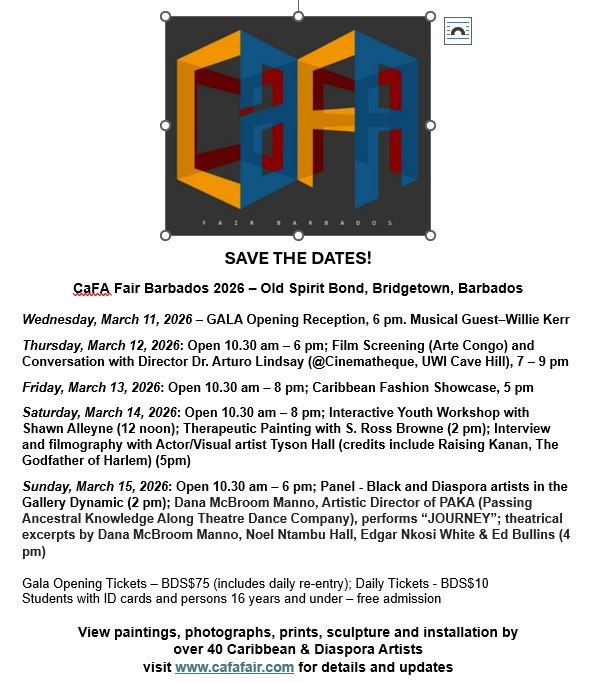 Come join the fun, March 11-15, 2026 at Old Spirit Bond, Barbados, West Indies. Yes Art. Fashion . Film . Performances . Panels. Do not miss this event.